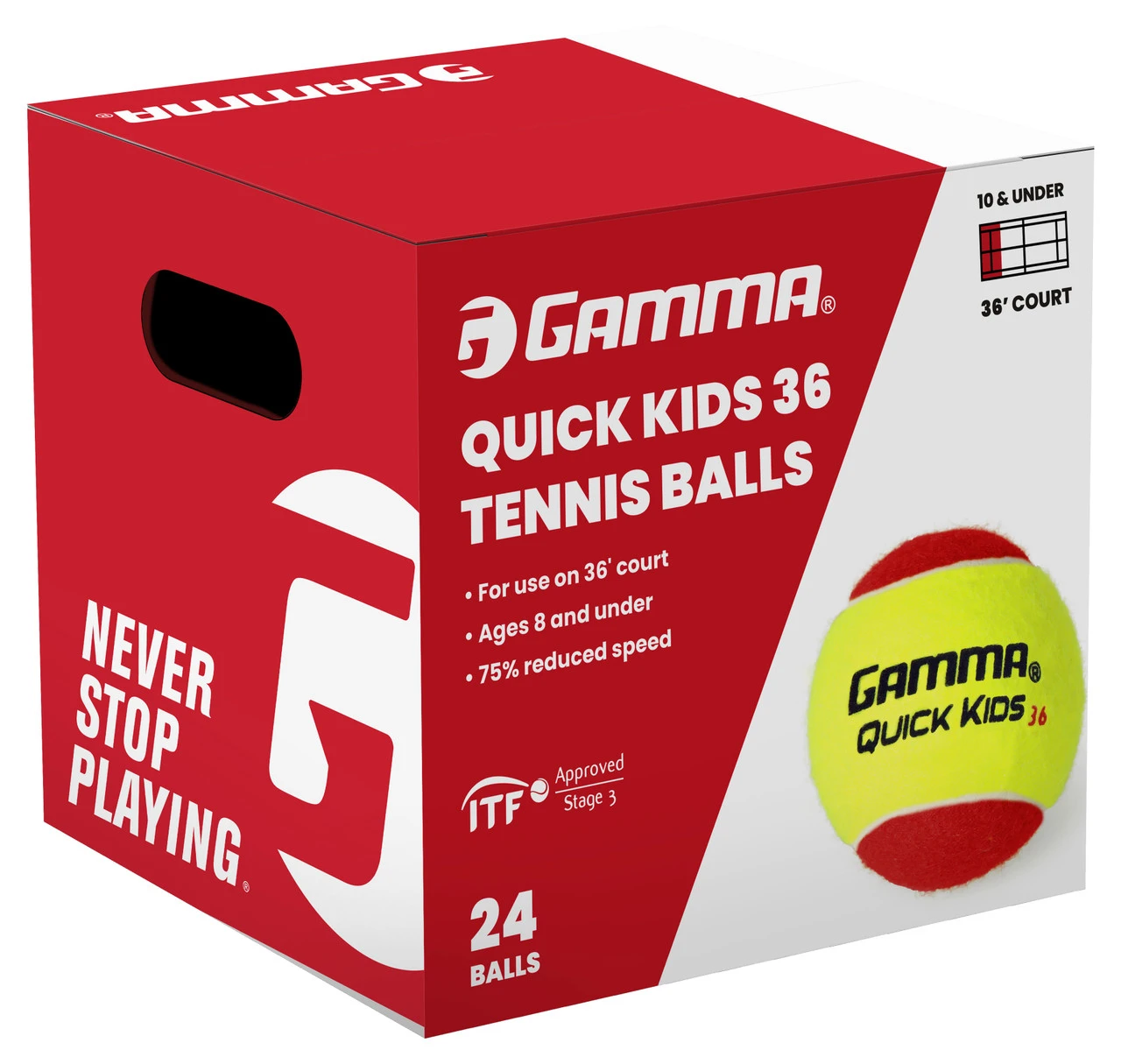 GAMMA Quick Kids 36 Stage 3 Red Junior Tennis Balls are low compression, felt balls which are the conventional balls at 70mm diameter. These are perfect for smaller children to learn tennis and are 75% slower than standard tennis balls.