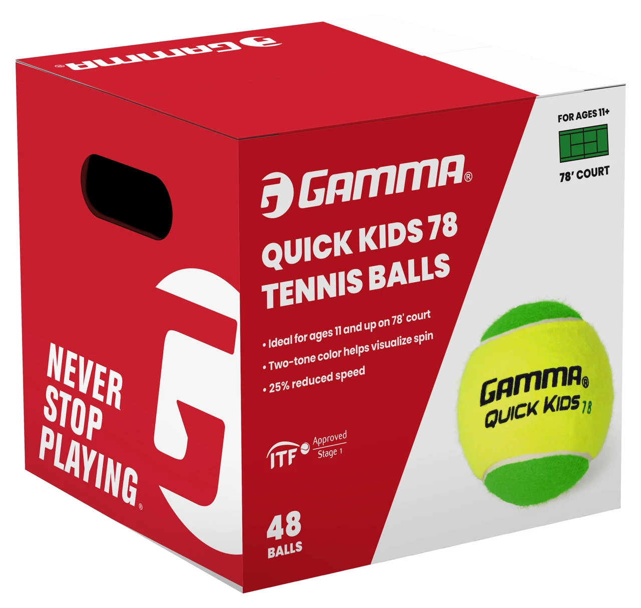GAMMA Quick Kids 78 Stage 1 Green Junior Tennis Balls would be suitable for children aged 11+ and are 25% slower than a standard tennis ball. Ideal lightweight balls for juniors transitioning to a full court.